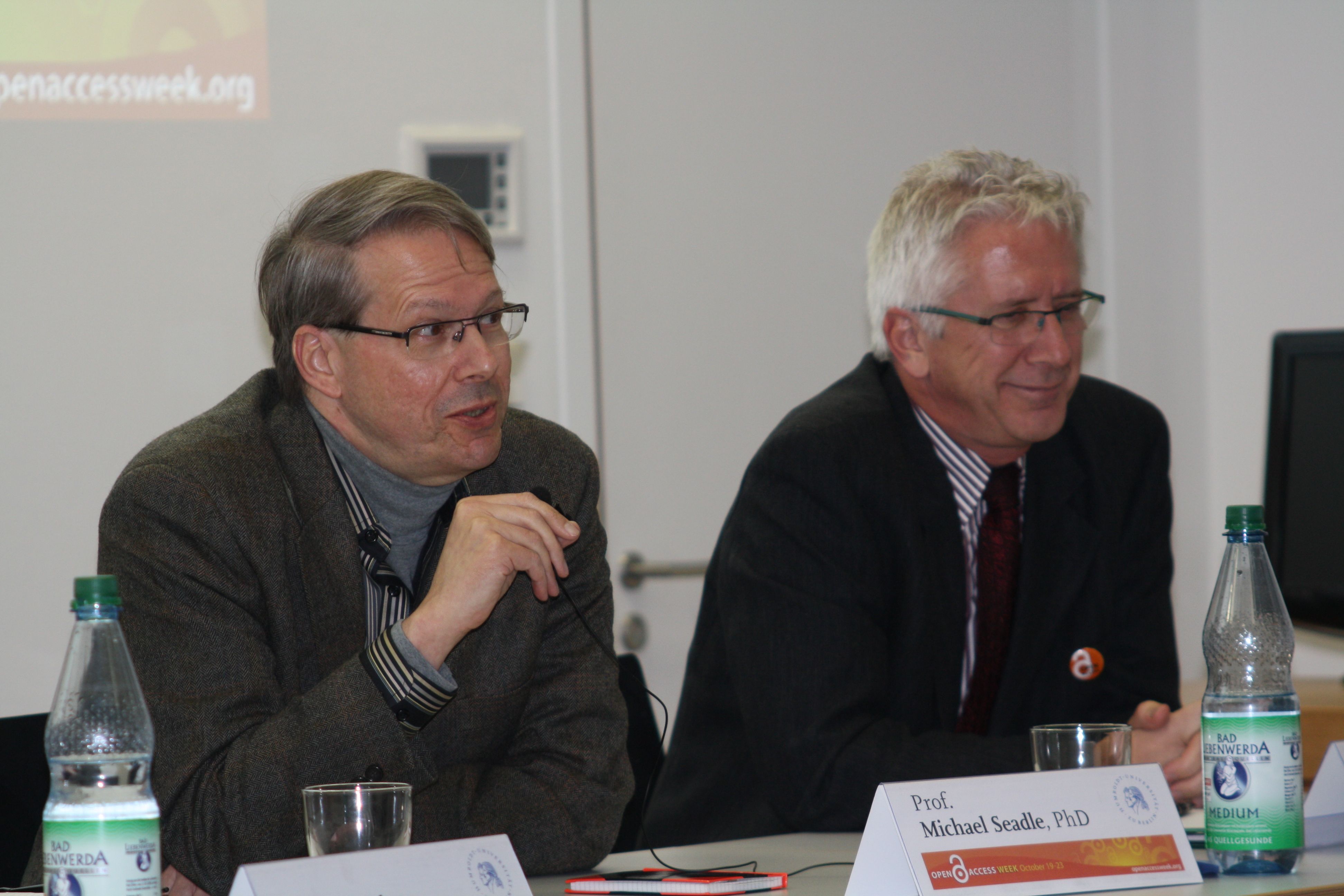 Humboldt-Universität zu Berlin | Institut für Bibliotheks- und Informationswissenschaft | Archiv | Termine und Nachrichten | Veranstaltungen | Impressionen von der Podiumsdiskussion an der Humboldt-Universität zur internationalen Open Access Week 2009 | Prof. Michael Seadle, PhD (Direktor des IBI) & Prof. Dr. Peter Schirmbacher (Direktor des CMS / IBI) Prof. Michael Seadle, PhD (Direktor des IBI) & Prof. Dr. Peter Schirmbacher (Direktor des CMS / IBI) None image/jpeg Typ image/jpeg Dimension Abmessungen 3888x2592 Size Dateigröße 676.1 KB Herunterladen Bild in voller Größe anzeigen…